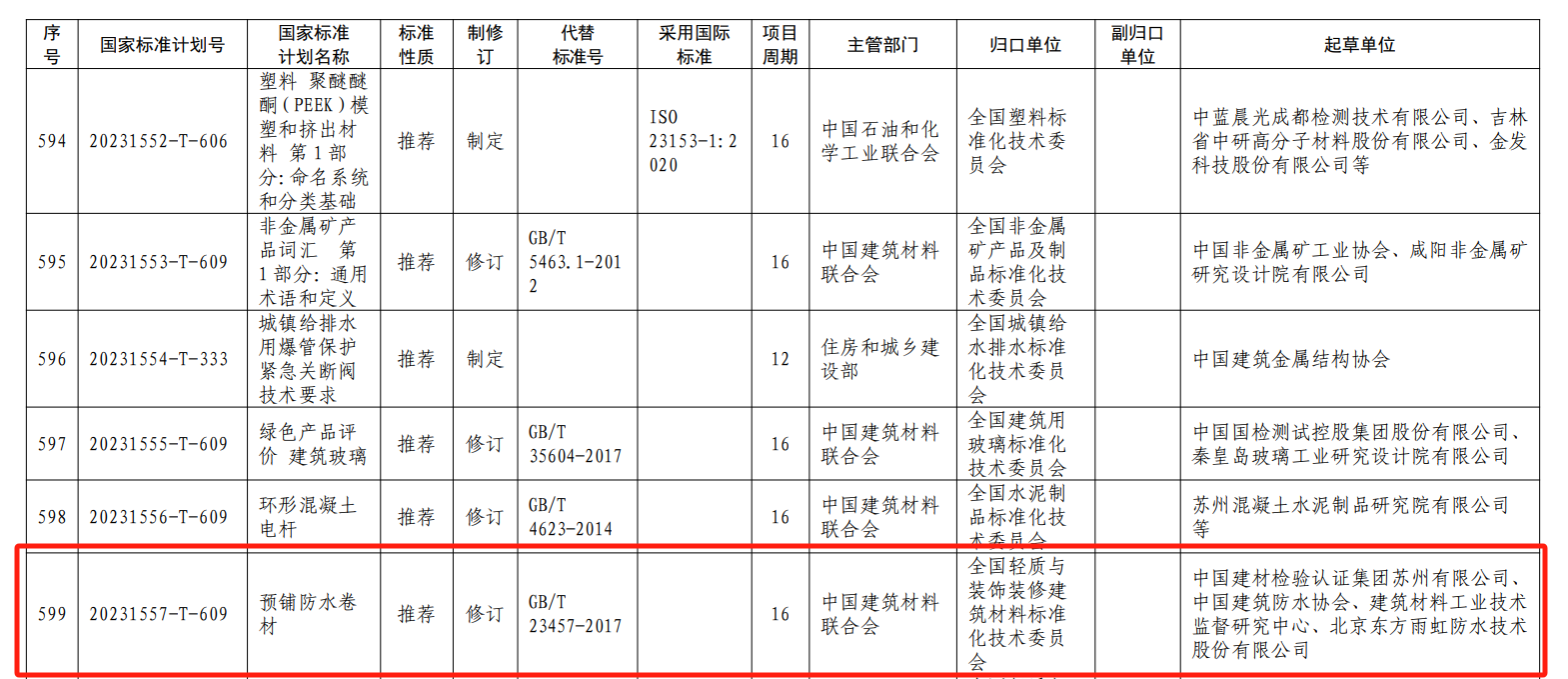 根據《國家標準化管理委員會關于下達2023 年第三批推薦性國家標準計劃及相關標準外文版計劃的通知》(國標委發[2023]58號),由我公司負責起草的建筑防水領域又一項重點標準項目GB/T 23457《預鋪防水卷材》(計劃號:20231557-T-609)及其外文版修訂計劃正式獲批立項。