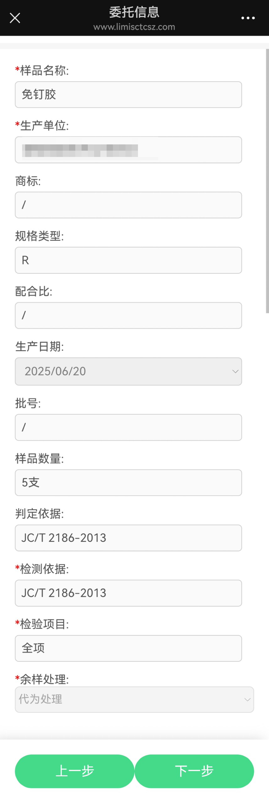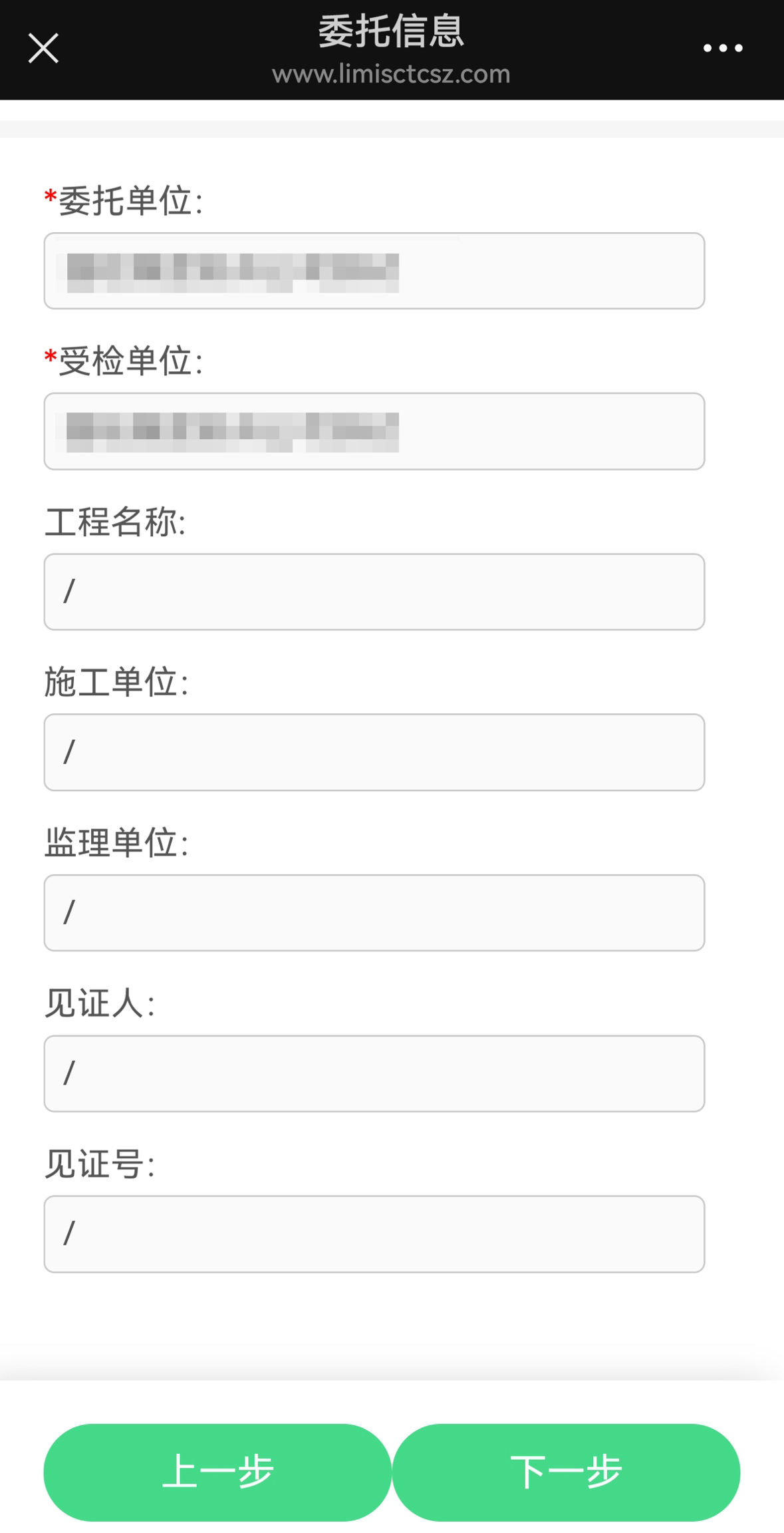 3. 點擊下一步,輸入:委托單位名稱、受檢單位名稱等信息。如為工程項目,請輸入工程名稱等信息
