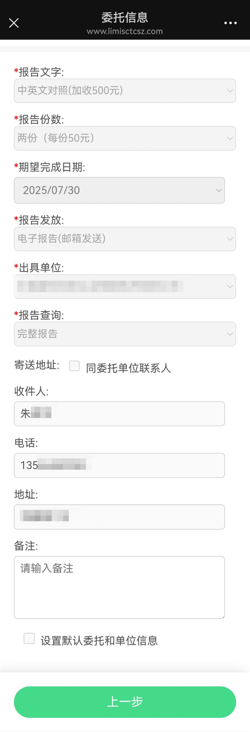 5. 點擊下一步,輸入:報告文字要求、份數(shù)、期望日期、報告形式、出具單位、真?zhèn)尾樵円蟮刃畔ⅰM瓿伤行畔浫耄c擊提交,等待客服聯(lián)系確認(rèn)