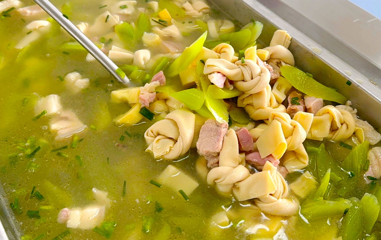 “腌”指的是咸肉,“篤”是蘇州話,即用小火燉煮的意思,“鮮”則指鮮肉和鮮筍。我們使用了這個季節最為時令的春筍,加入萵筍、百葉結和火腿,用一鍋超鮮美的腌篤鮮,迎接美好的春天。