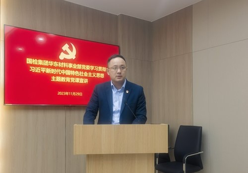 隨著主題教育不斷深入開展,為進一步扎實做好學習貫徹習近平新時代中國特色社會主義思想的深化、內化、轉化工作,11月29日,國檢集團黨委副書記、總經理陳璐到華東材料事業部給事業部全體黨員作題為《新時代新征程、高標準引領高質量發展》的黨課宣講,國檢集團總經理助理、華東材料事業部黨委書記、董事長彭超主持會議。