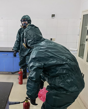此次演練首次采用了設(shè)定劇本—桌面演練--現(xiàn)場(chǎng)演練—開(kāi)會(huì)總結(jié)模式,根據(jù)應(yīng)急組織體系、把總指揮、滅火救援組、警戒疏散組、醫(yī)療救護(hù)組、通訊聯(lián)絡(luò)組職責(zé)一一落實(shí)到人,將實(shí)驗(yàn)室發(fā)生化學(xué)品泄露,處理過(guò)程發(fā)生火災(zāi)等事件串聯(lián)起來(lái),同時(shí)進(jìn)行化學(xué)品泄露應(yīng)急演練、火災(zāi)事故應(yīng)急演練、緊急疏散應(yīng)急演練、危廢處理演練等。